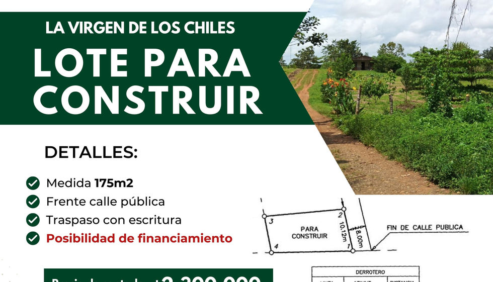 Lote de 175 m² listo para construir en La Virgen de Los Chiles, Alajuela. Ubicado frente a calle pública, en una zona tranquila y con acceso a servicios básicos disponibles, este terreno cuenta con plano catastrado y se encuentra completamente libre, lo que permite una venta segura e inmediata mediante traspaso y escritura.